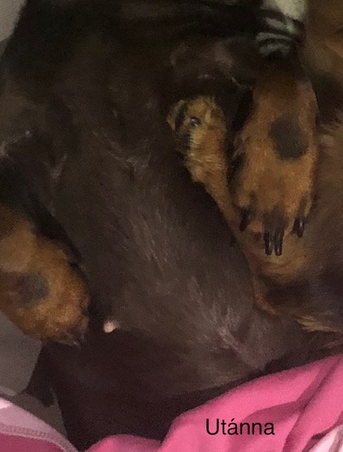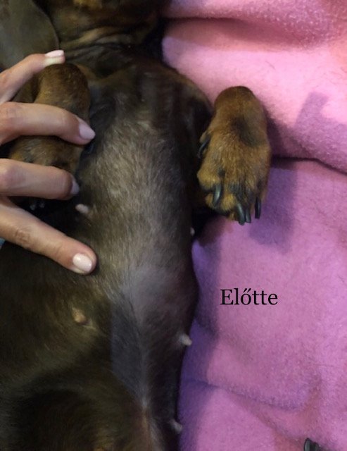 Bodza nevű tacskó kutyusom álvemhes lett, majd jött a szőrhullás és “kopaszodás”. Gondoltam a hormonok. 2019.06.03-től szőr vitamint kapott orvos tanácsára. A nyakán foltokban hiányzott a szőr, illetve a hasa két oldalán tükrösen. A mellkas részen már szőr nem volt és a nyakán kis hólyagok jelentek meg. Orvosi javaslatra gyógysamponnal fürdettem 4 naponta. A hasa oldalán eltűntek a foltok és a nyaka foltos maradt. Így orvosi javaslatra 07.29-től újabb szőr vitamin kúrát kezdtünk, többek között, hogy “ártani nem árt” -mondta az orvos.
